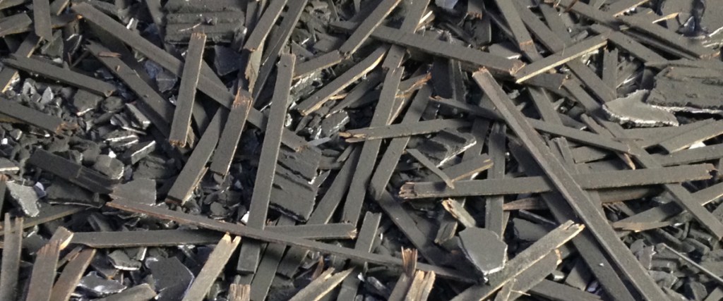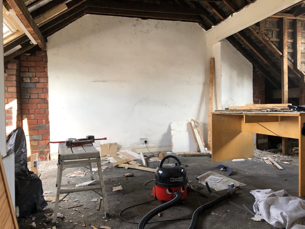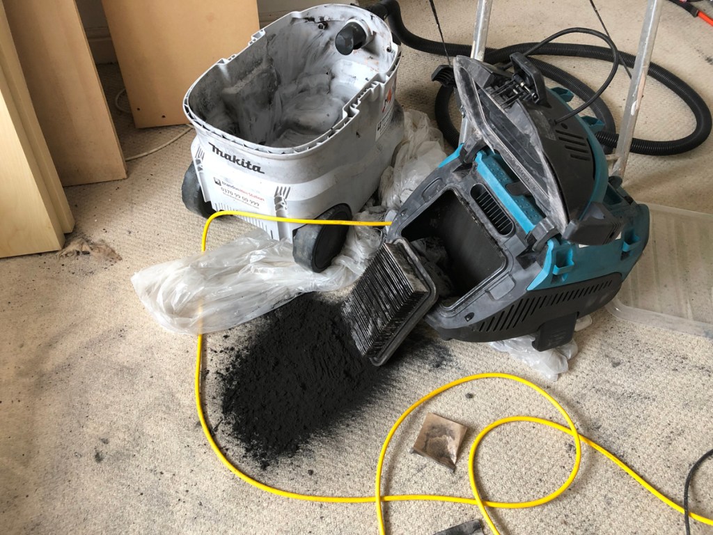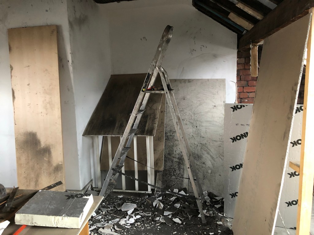 “Demolish it all in one go and get out of there to leave it to settle”- advice after the fact. I come from the tidy-up-as-you-go school and tried a more controlled response sucking up the soot with a big hired vacuum cleaner as it became revealed. It was never quite happy with the job, the filter clogging regularly.