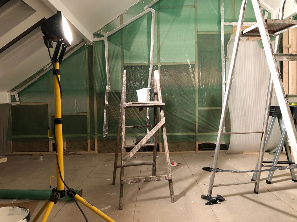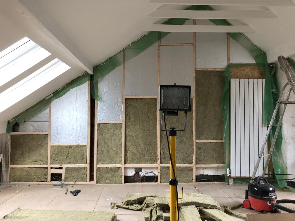 Plasterboard is then fixed over the insulation ready for the plaster finish.