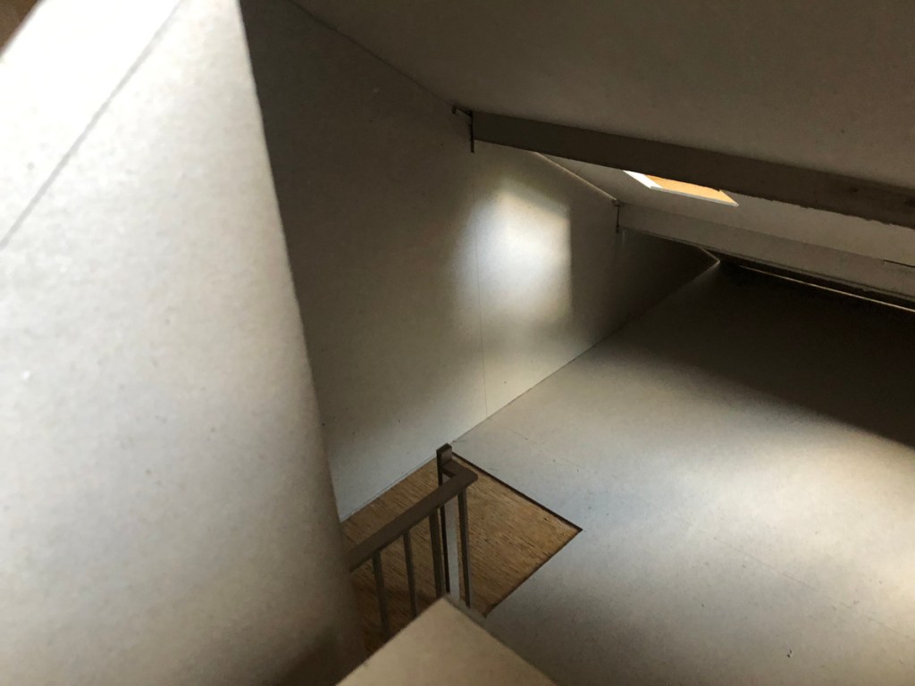The small rooflight delivers light down into the stairwell with the stairs now appearing a feature in themselves- the Attic Spirit just seen- and instead of ascending into gloom you are drawn up by bright light which is a welcome psychological shift.