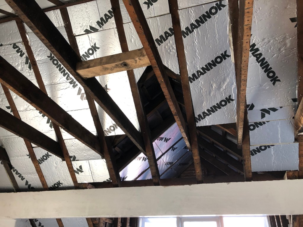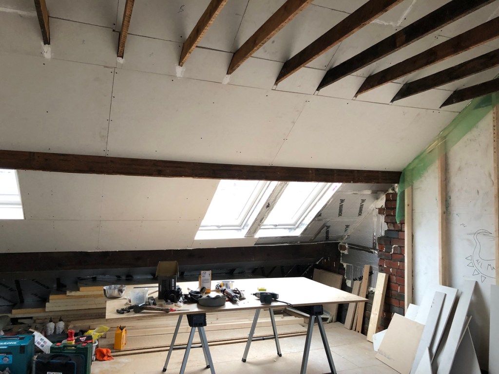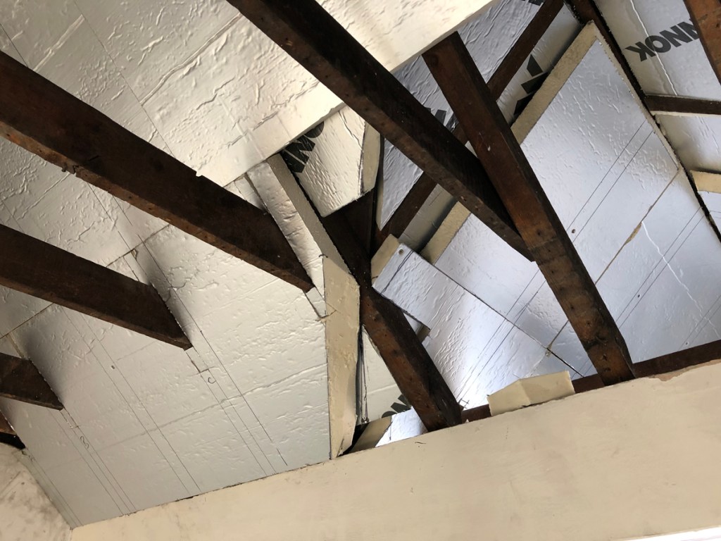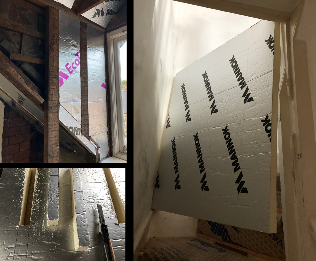 Insulation was placed between the roof rafters and I was very fussy about fitting these snugly to the irregular geometry of the rafters where a builder would cut them to the narrowest width and fill the gap with foam. Such care for something that is going to be covered up but it felt thorough.