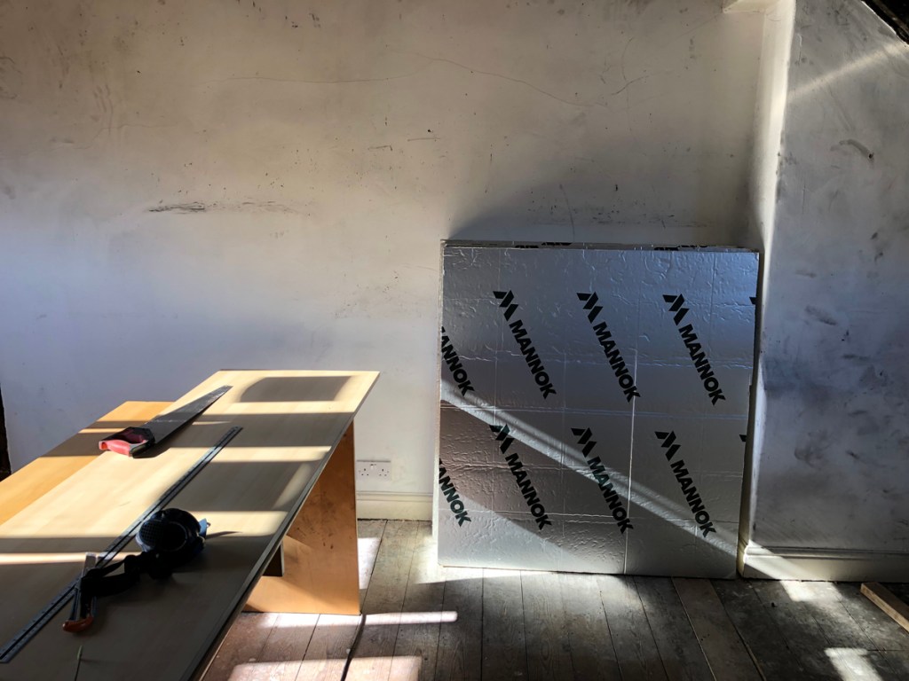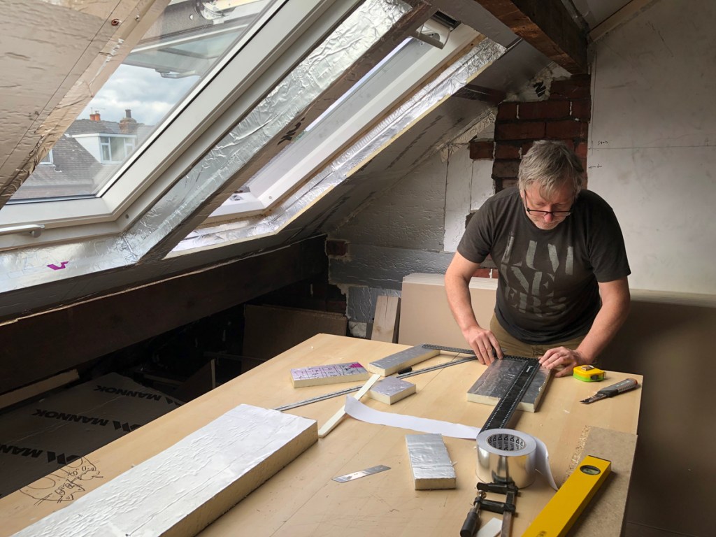 The geometry of the winding stair determined the shape and depth of the board transported up, otherwise the reflective insulation made for the light and airy phase of the work and I enjoyed its presence around the house.
