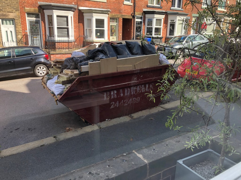 My aesthetic urges made for a slower process, keeping the site tidy and clean. Having a nicely composed skip was an extension of this and material was arranged instead of flung . Note the so-called “greedy boards” that increase the volume, and we still got through three skips!