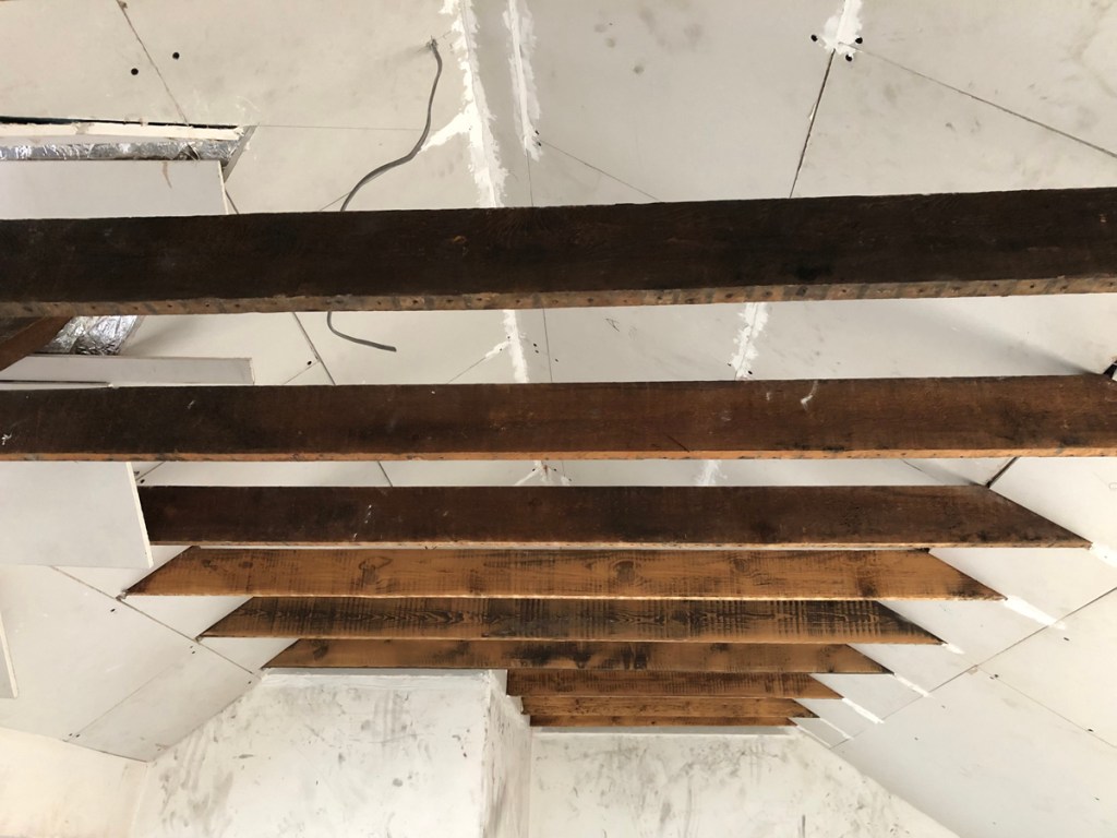 And more subtle but still perceptible with the orange paint applied to the top of the ceiling joists (just close to the sloped ceiling only).
