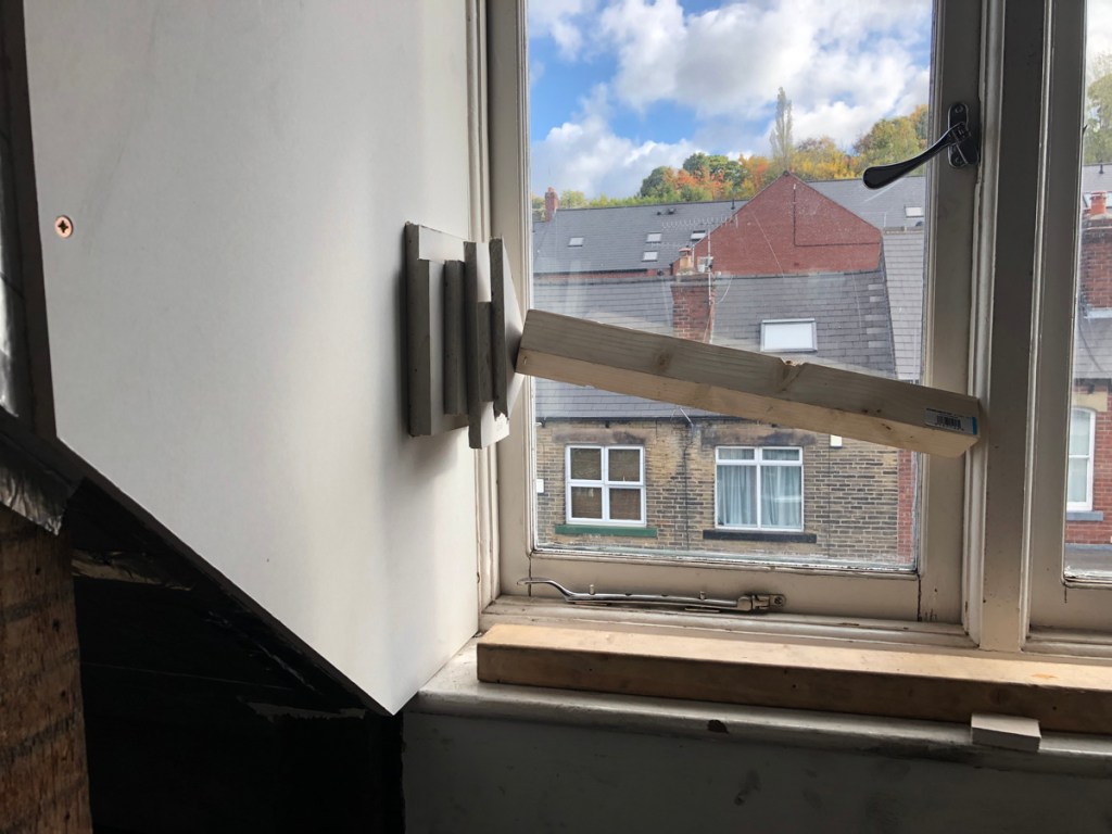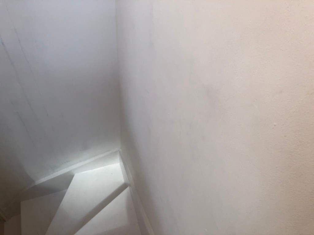 Hidden behind the white finishes of these houses is decades of soot and dust that has found its way in between the uneven slate tiles and other routes, stored up out of sight behind the wooden lathe and plaster that made up all the walls and ceilings below the roof. The side walls were brick and plaster and also spewed out black soot.