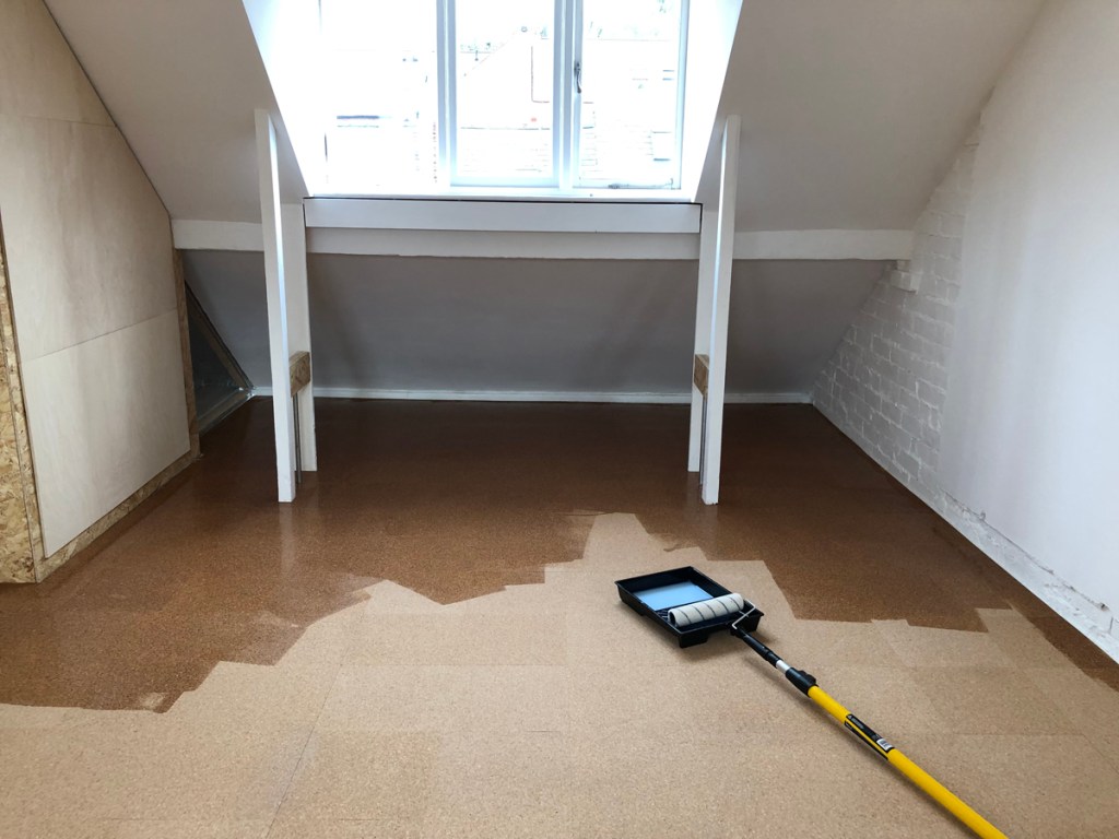 Cork tiles laid and sealed.