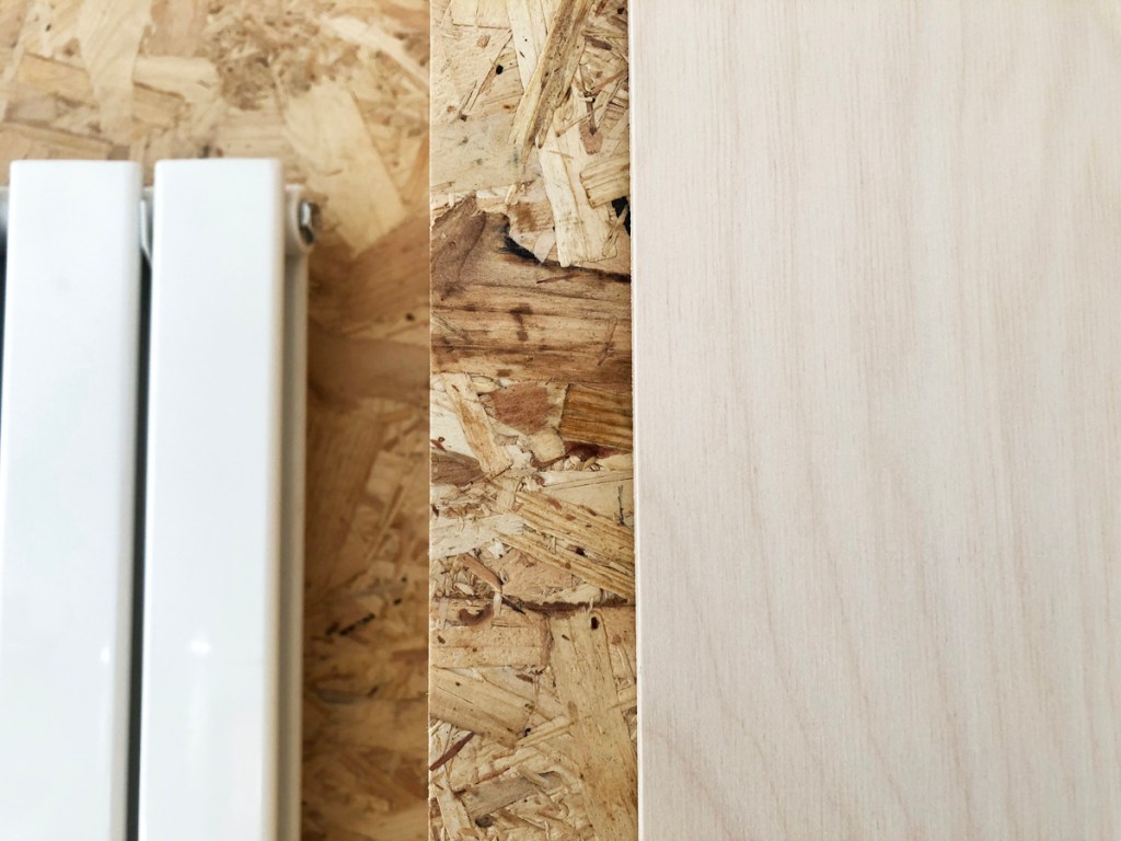 The combining of alley cat utilitarian OSB board and with the fine airs of birch plywood was entirely accidental, exciting and original for me (I’ve seen it since) and helped overcome a big problem with solo installation.