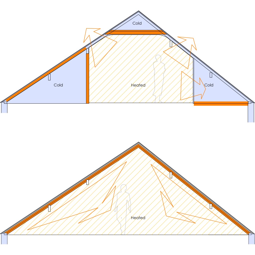 The continuity of insulation was critical to its success, and the sections below show how a patchwork of insulation (in orange) and cold surfaces made the room hard to keep warm, and how a triangular arch of continuous insulation now keeps the warmth in with more evenness of temperature across the room.
