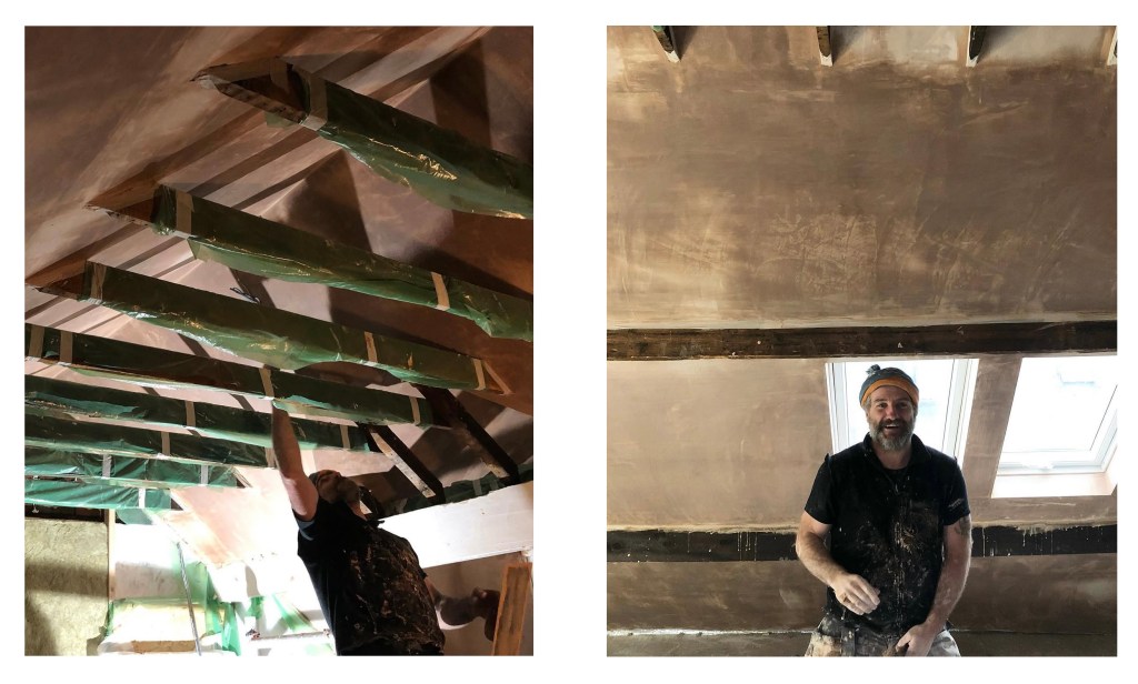 As a self-builder you start to wonder if you can turn your hand to anything, but plastering these large areas, negotiating the timbers and the slope down to the floor- no way! And this is where the aforementioned heroics of plasterer Steve Kitagawa came in.